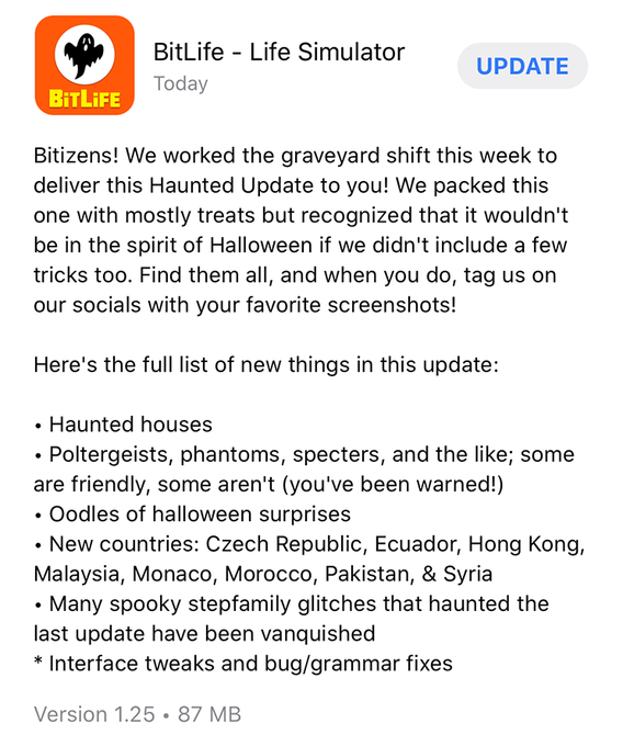 Halloween RT @BitLifeApp: 👻 The Haunted Update has dropped on iOS! 🎃 Happy Halloween, Bitizens! ☝️ As always, you may need to pull it manually from the App Store to get it the quickest! https://t.co/8SWrrbOB8b